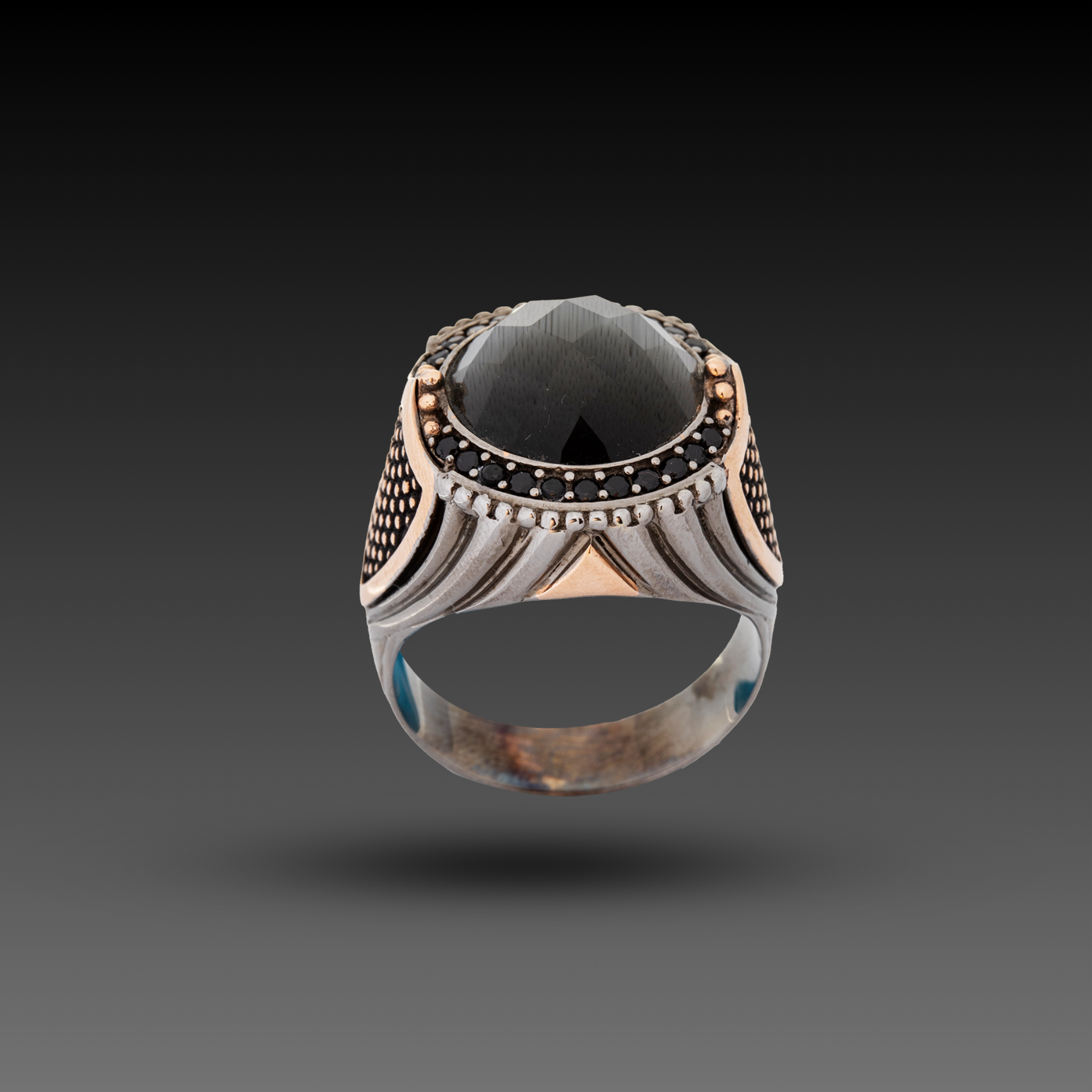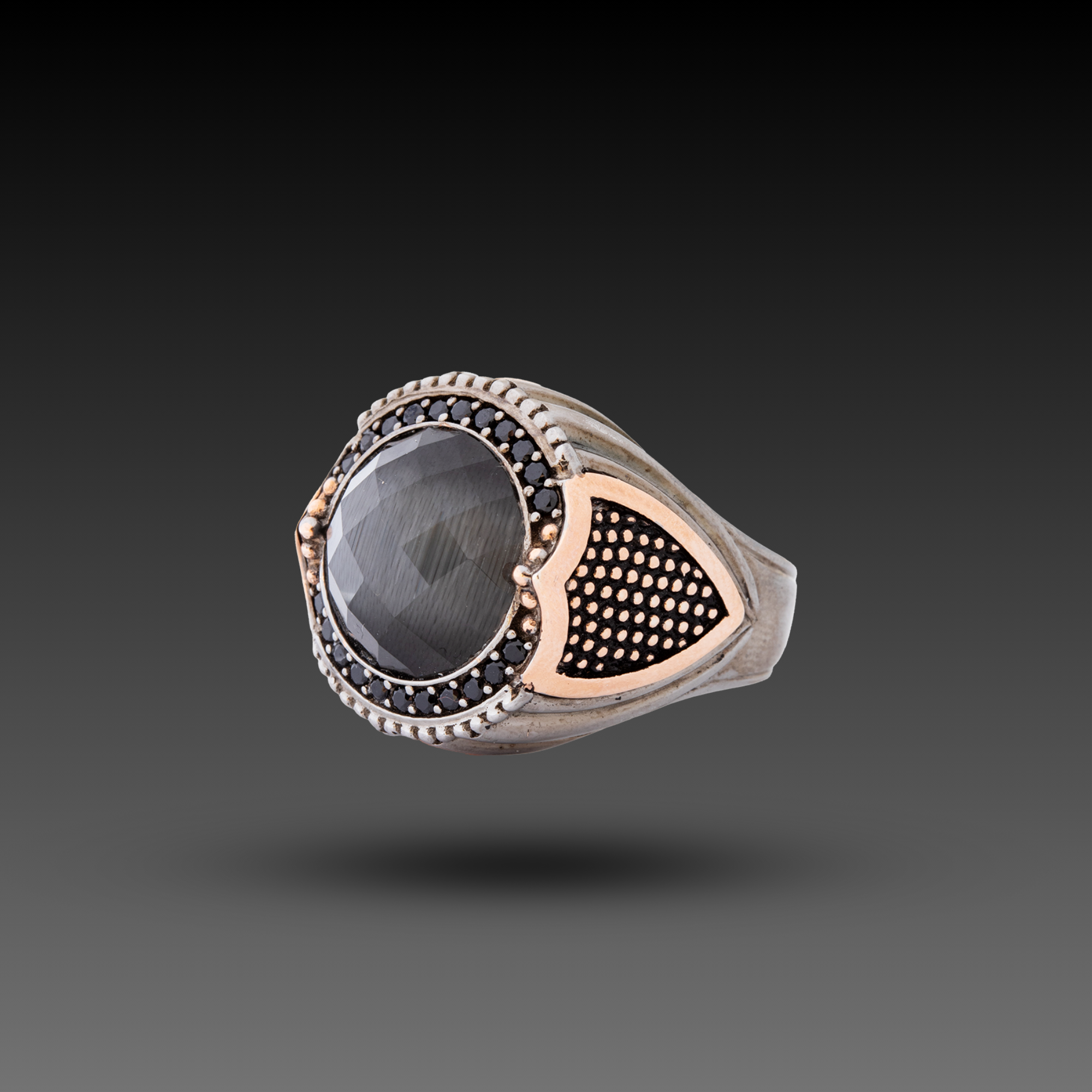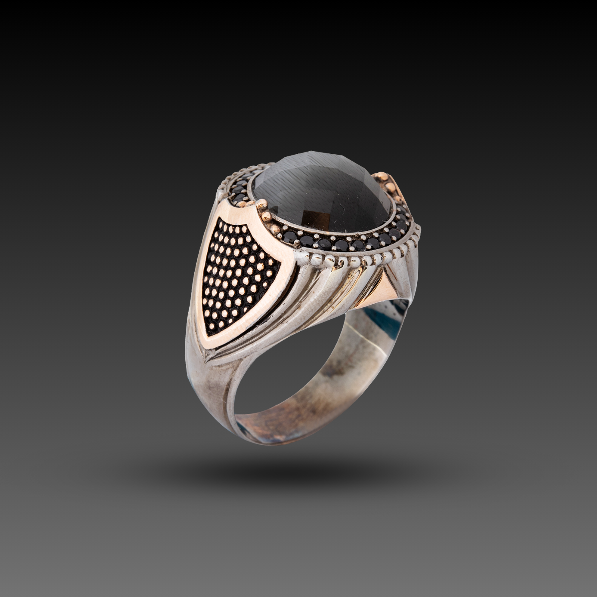 Kalkan figürlü kedigözü taşlı yüzük. Maden: Altın ve Gümüş Renk: Sarı, Siyah Gramı: Altın (333) 0,67 | Gümüş (925) 10,46 Ayar: 8K (333) , 925 Gümüş Ürün Kodu: CKJR250115